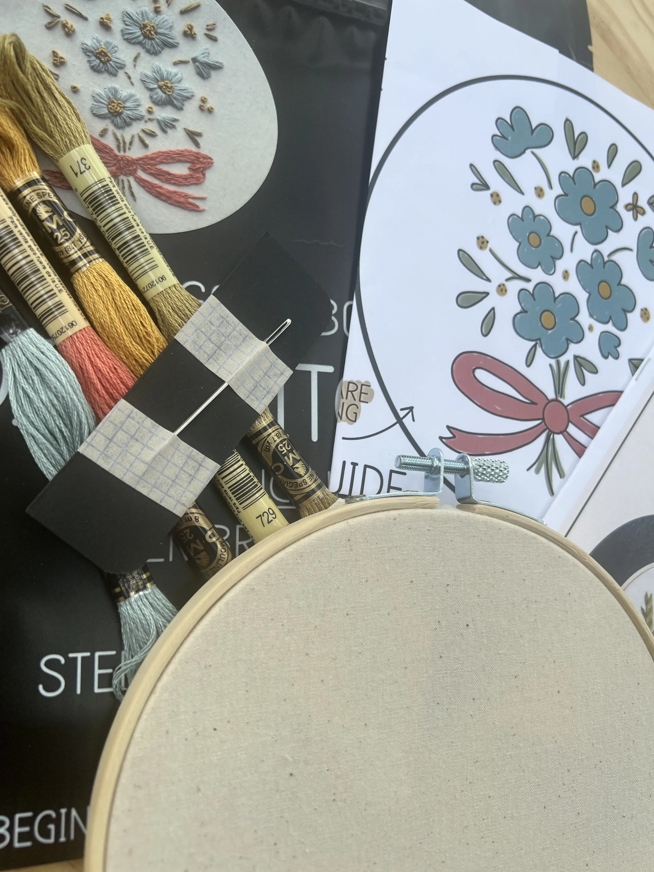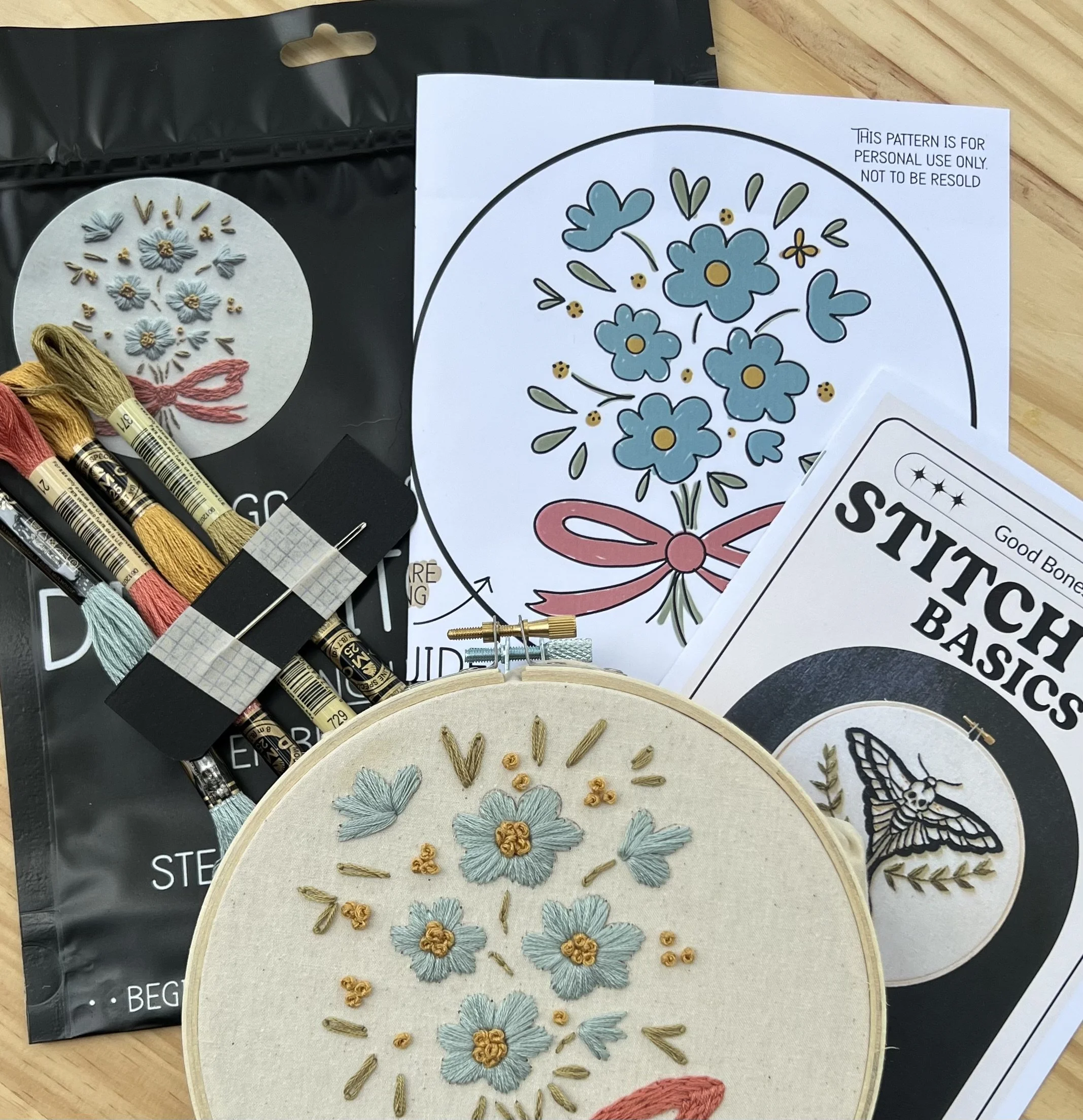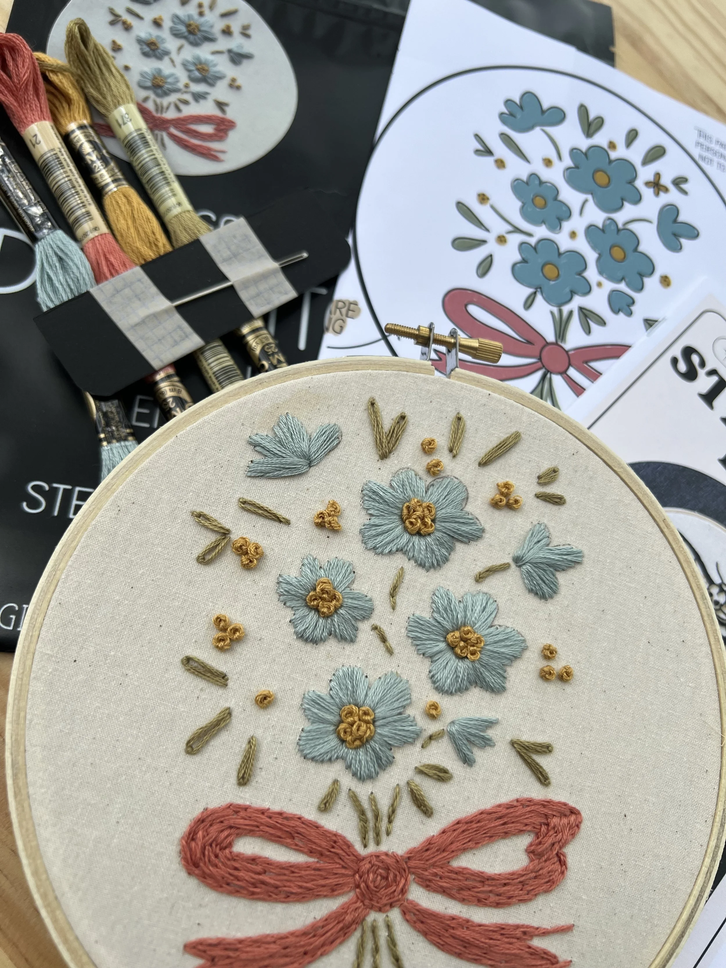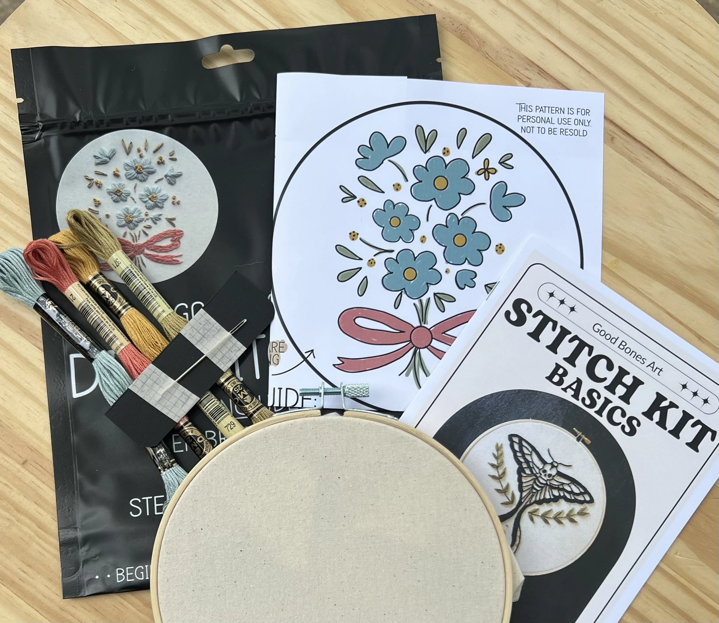 This D.I.Y. Stitch kit is for any skill level, even if you have never picked up a needle before! Comes with all that need to start your embroidery journey, a reusable instruction booklet, threads, 6” hoop, needle, fabric, and pattern sheet. You can really make this a fun and unique piece of art.