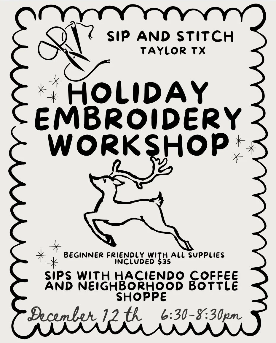 Workshops Categories: Select a Category Downloads Embroidery kits Workshops Stickers Holiday embroidery workshop at sip and stitch $35.00